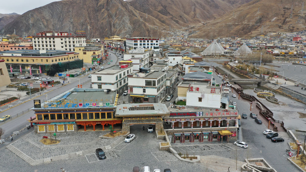 ↑ 圖為2021年3月10日拍攝的玉樹(shù)市一處商業(yè)區(qū)(地震前為結(jié)古寺賓館)。