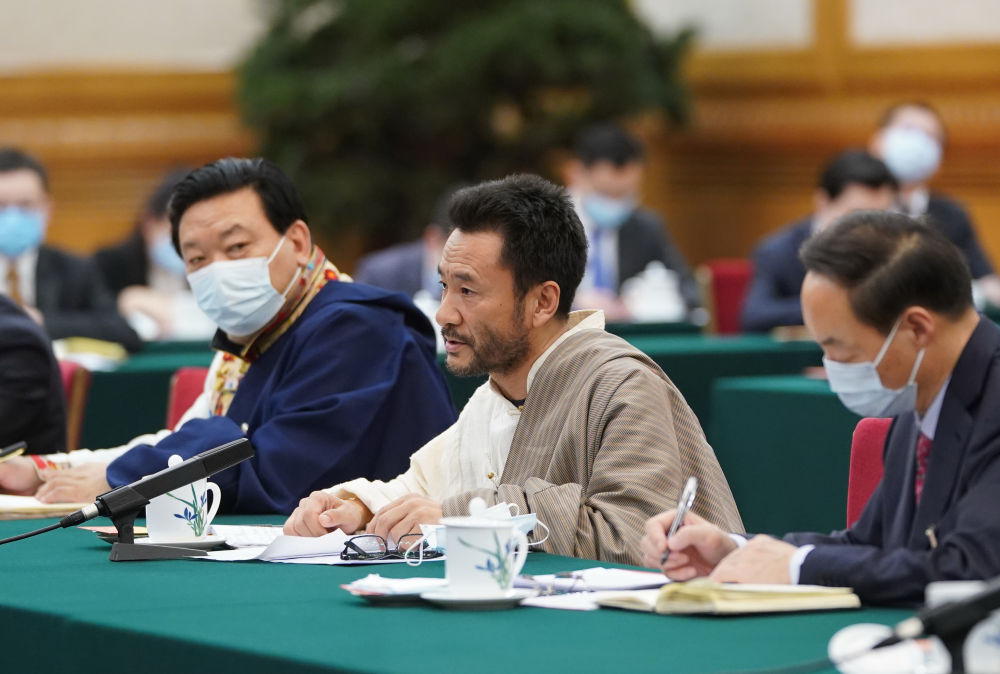 ↑ 3月7日,在參加十三屆全國(guó)人大四次會(huì)議青海代表團(tuán)審議時(shí),扎西多杰就玉樹(shù)災(zāi)后重建新變化發(fā)言。新華社記者李學(xué)仁攝