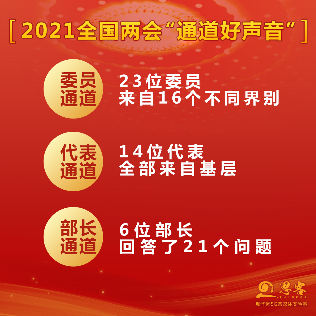 3月11日,2021年全國(guó)兩會(huì)圓滿落下帷幕。會(huì)議期間共舉行了2場(chǎng)“代表通道”、3場(chǎng)“委員通道”、2場(chǎng)“部長(zhǎng)通道”。今年的7場(chǎng)“通道”受到網(wǎng)民留言點(diǎn)贊,“回答很有意思,故事里有深意”“不避熱點(diǎn)難題,回答讓人解渴”“務(wù)實(shí)、誠(chéng)懇、有態(tài)度”“滿滿的自信,中國(guó)未來(lái)更給力”……
