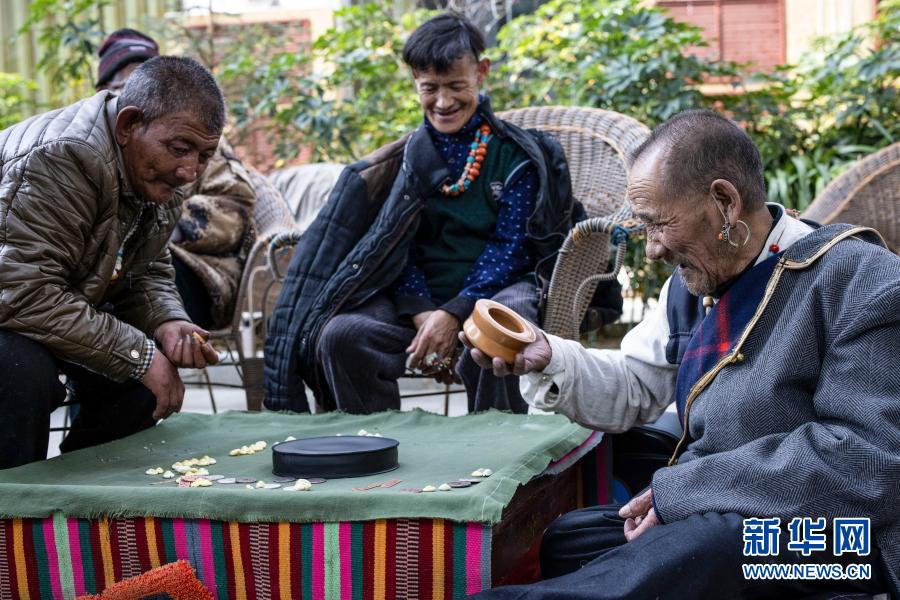 次旦(右)在集中供養(yǎng)服務(wù)中心和朋友們一起進(jìn)行娛樂活動(3月19日攝)。