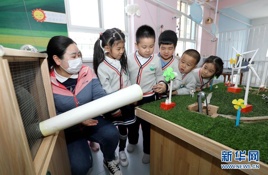 3月22日,在河北省石家莊市橋西區(qū)瑞特幼兒園,老師通過“風的超能力”科普實驗,讓孩子們感受風能的作用。新華社發(fā)(梁子棟 攝)