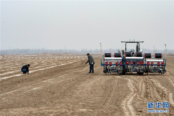 在位于新疆喀什地區(qū)莎車縣的棉田里,農(nóng)民在播種棉籽(3月26日攝)。新華社記者 馬鍇 攝