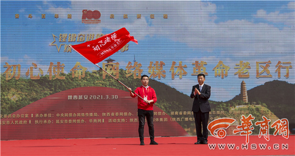 主會場活動結束后,陜西分會場“在這里讀懂初心使命——網(wǎng)絡媒體革命老區(qū)行”網(wǎng)絡主題采訪活動在延安寶塔山游客廣場正式啟動。趙剛在分會場啟動儀式上講話并向采訪團授旗。陜西省委網(wǎng)信辦主任鮑永能主持啟動儀式。中央網(wǎng)信辦網(wǎng)絡傳播局副局長邵波濤,陜西省委網(wǎng)信辦副主任王利參加啟動儀式。延安市委副書記、政法委書記嚴漢平在啟動儀式上致辭。媒體團代表中國新聞網(wǎng)負責人吳慶才作表態(tài)發(fā)言。