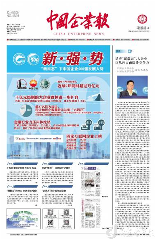 《中國企業(yè)報(bào)》是由中國企業(yè)聯(lián)合會(huì)、中國企業(yè)家協(xié)會(huì)主管主辦,是中國唯一以企業(yè)和企業(yè)家為報(bào)道核心的中央級(jí)媒體?!吨袊髽I(yè)報(bào)》是一張專為中國企業(yè)創(chuàng)辦的報(bào)紙。1988年1月4日,由國家經(jīng)委主辦,中國企業(yè)管理協(xié)會(huì)承辦的《中國企業(yè)報(bào)》正式創(chuàng)刊。陳云同志為報(bào)紙題寫了報(bào)頭,鄧力群任報(bào)社名譽(yù)顧問,袁寶華任報(bào)社名譽(yù)社長(zhǎng)。從1988年創(chuàng)辦至今,秉承“面向企業(yè),為企業(yè)服務(wù)”的辦報(bào)宗旨,親歷和記錄著中國企業(yè)的改革進(jìn)程,同時(shí)伴隨著中國企業(yè)的發(fā)展壯大而不斷成長(zhǎng)。經(jīng)過20多年的實(shí)踐探索,在報(bào)道企業(yè)新聞、推動(dòng)企業(yè)改革、維護(hù)企業(yè)權(quán)益、促進(jìn)企業(yè)發(fā)展等方面,逐步形成了自身的風(fēng)格和特色,專業(yè)性、權(quán)威性日益得到了企業(yè)界和新聞界的認(rèn)同。