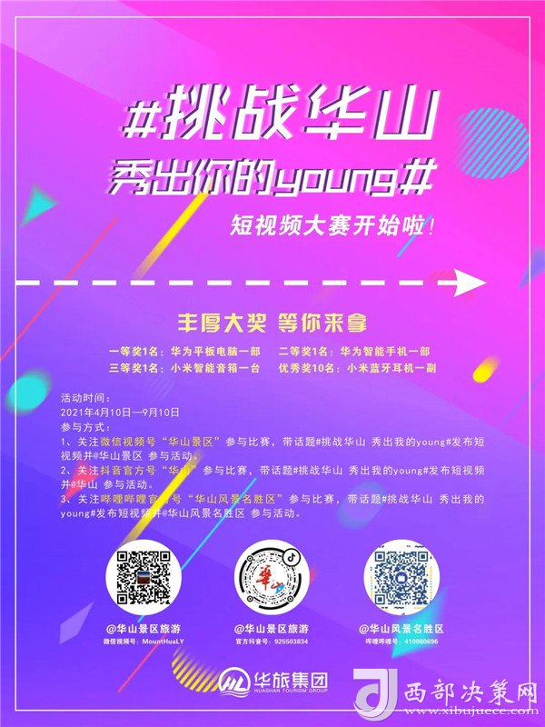 朝氣蓬勃的青年學(xué)生擁有敏銳的感受力和發(fā)現(xiàn)美的能力。為了進(jìn)一步挖掘華山獨(dú)特自然風(fēng)光及厚重的文化內(nèi)涵,激發(fā)大學(xué)生群體的創(chuàng)作才能,華旅集團(tuán)營銷中心特向大學(xué)生推出“挑戰(zhàn)華山 秀出你的young”短視頻大賽,在比賽之余,可圍繞華山自然風(fēng)光、人文歷史、傳說典故、道教文化等進(jìn)行創(chuàng)作,以年輕人的視角展示華山獨(dú)特之美,活動(dòng)自4月10日起,在微信視頻號(hào)(華山景區(qū))、抖音APP(華山)、嗶哩嗶哩(華山風(fēng)景名勝區(qū))等平臺(tái)正式啟動(dòng)。