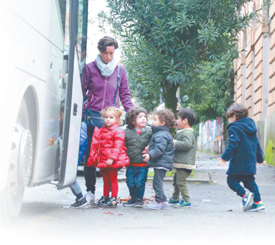 意大利羅馬一家幼兒園的小朋友們在老師的組織下登上校車。 本報記者 韓 碩攝
