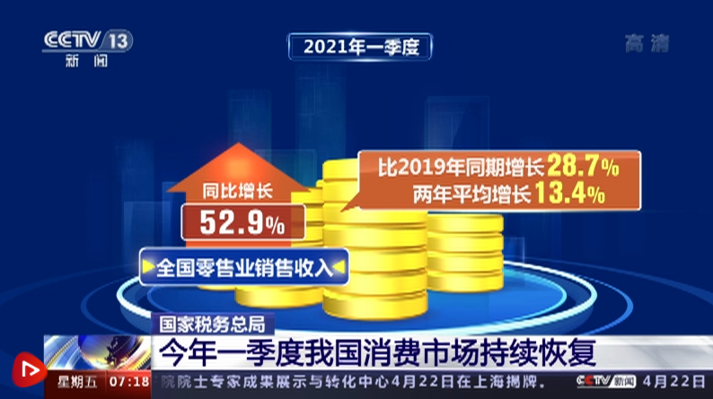 央視網(wǎng)消息:國家稅務總局數(shù)據(jù)顯示,一季度,我國零售業(yè)銷售收入兩年平均增長超10%,消費市場持續(xù)恢復。