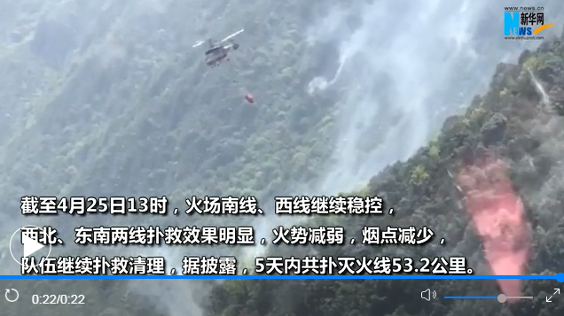 截至4月25日13時(shí),火場(chǎng)南線、西線繼續(xù)穩(wěn)控,西北、東南兩線撲救效果明顯,火勢(shì)減弱,煙點(diǎn)減少,隊(duì)伍繼續(xù)撲救清理,據(jù)披露,5天內(nèi)共撲滅火線53.2公里,撲打明火77處,清理煙點(diǎn)2382處。
