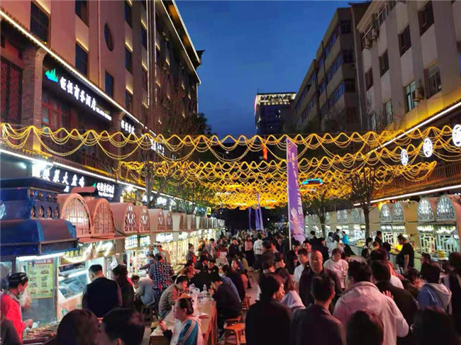 下午六七點(diǎn),這里一百多個(gè)商戶支起攤位,羊蹄、羊雜碎、洋芋擦擦、洋芋沫沫、雜面等三十多種特色小吃冒著熱氣。街道人流如織,直到凌晨?jī)牲c(diǎn)依舊燈火通明。