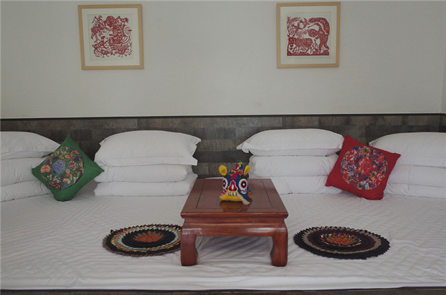 “大到喝茶的桌椅,小到墻上的剪紙,都是找專門手藝人做的。”小雅指著“炕”上的花坐墊說(shuō),這也是拿小孩不穿的布帛縫起來(lái)的,展現(xiàn)陜北特色的“百家衣”風(fēng)格。陜北炕比較冰冷,她們就用木頭把炕包起來(lái),再鋪上軟墊。