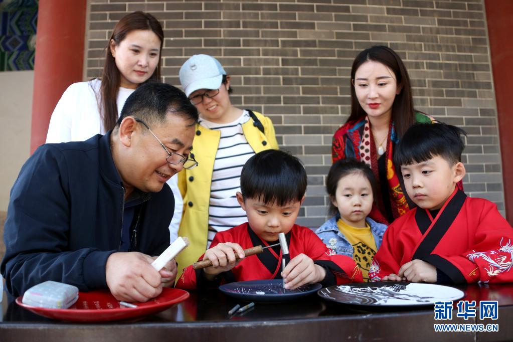 5月1日,在山東省棗莊市孟莊鎮(zhèn)境內(nèi)的龜山風(fēng)景區(qū),民間藝人胡安同(前左一)向小朋友傳授非遺刻瓷技藝。文化和旅游部5月5日晚間公布2021年“五一”假期旅游市場數(shù)據(jù)。統(tǒng)計顯示,5月1日至5日,全國國內(nèi)旅游出游2.3億人次,同比增長119.7%,按可比口徑恢復(fù)至疫前同期的103.2%。新華社發(fā)(孫中喆 攝)