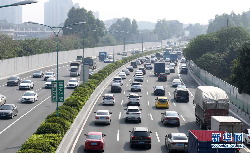 5月1日,廣州環(huán)城高速公路上車行緩慢。當(dāng)日,廣州周邊高速公路迎來出行高峰。文化和旅游部5月5日晚間公布2021年“五一”假期旅游市場數(shù)據(jù)。統(tǒng)計顯示,5月1日至5日,全國國內(nèi)旅游出游2.3億人次,同比增長119.7%,按可比口徑恢復(fù)至疫前同期的103.2%。新華社記者 盧漢欣 攝