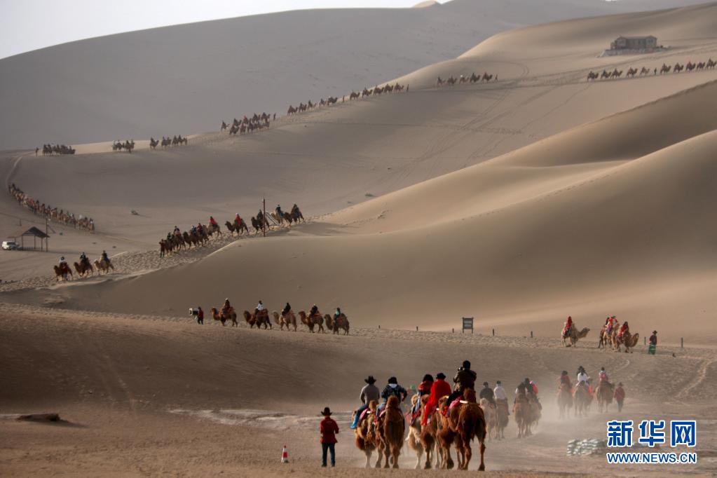 5月1日,游客在甘肅省敦煌市鳴沙山月牙泉景區(qū)游覽。文化和旅游部5月5日晚間公布2021年“五一”假期旅游市場數(shù)據(jù)。統(tǒng)計顯示,5月1日至5日,全國國內(nèi)旅游出游2.3億人次,同比增長119.7%,按可比口徑恢復(fù)至疫前同期的103.2%。新華社發(fā)(張曉亮 攝)