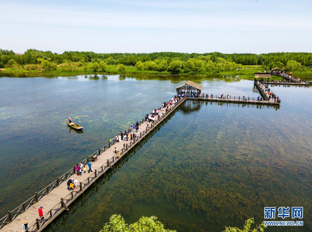 5月2日,游客在江蘇省泰州市姜堰區(qū)溱湖國家濕地公園棧道上游覽(無人機(jī)照片)。文化和旅游部5月5日晚間公布2021年“五一”假期旅游市場數(shù)據(jù)。統(tǒng)計顯示,5月1日至5日,全國國內(nèi)旅游出游2.3億人次,同比增長119.7%,按可比口徑恢復(fù)至疫前同期的103.2%。新華社發(fā)(顧繼紅 攝)
