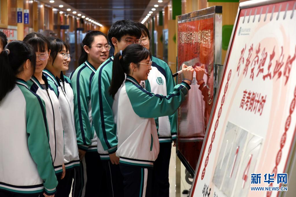 5月23日,青島通濟實驗學校高三學生在簽名板上留言相互鼓勵。新華社記者 李紫恒 攝