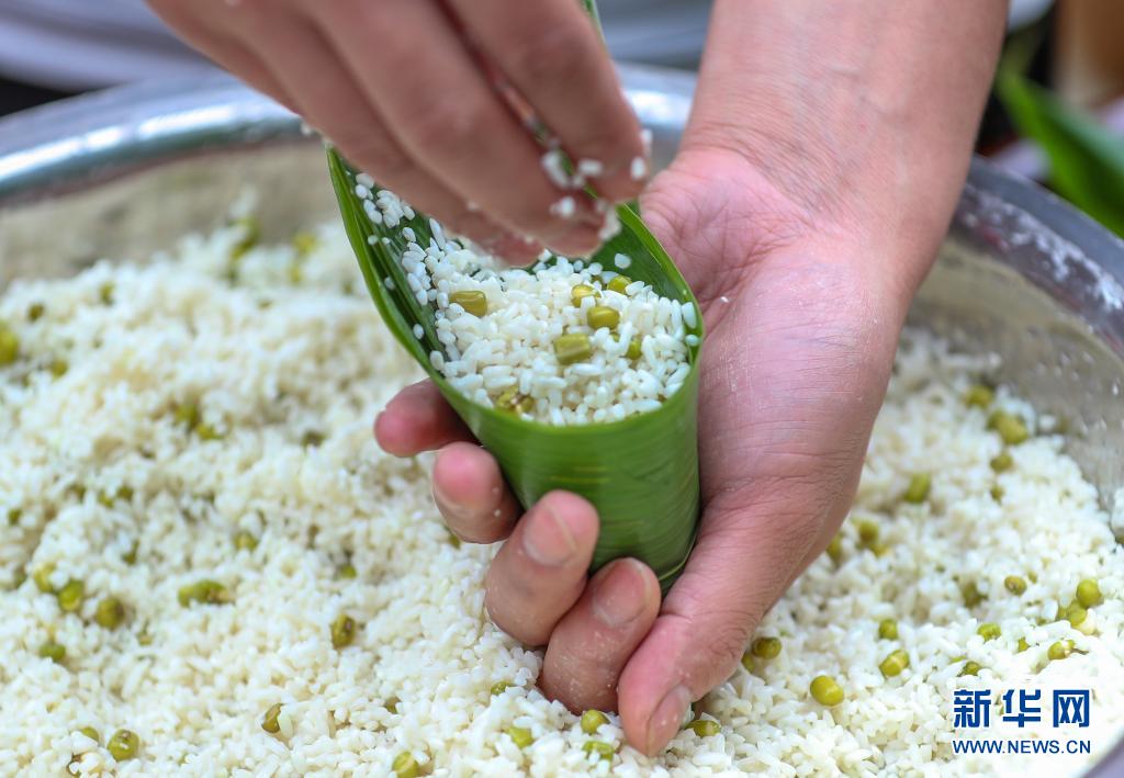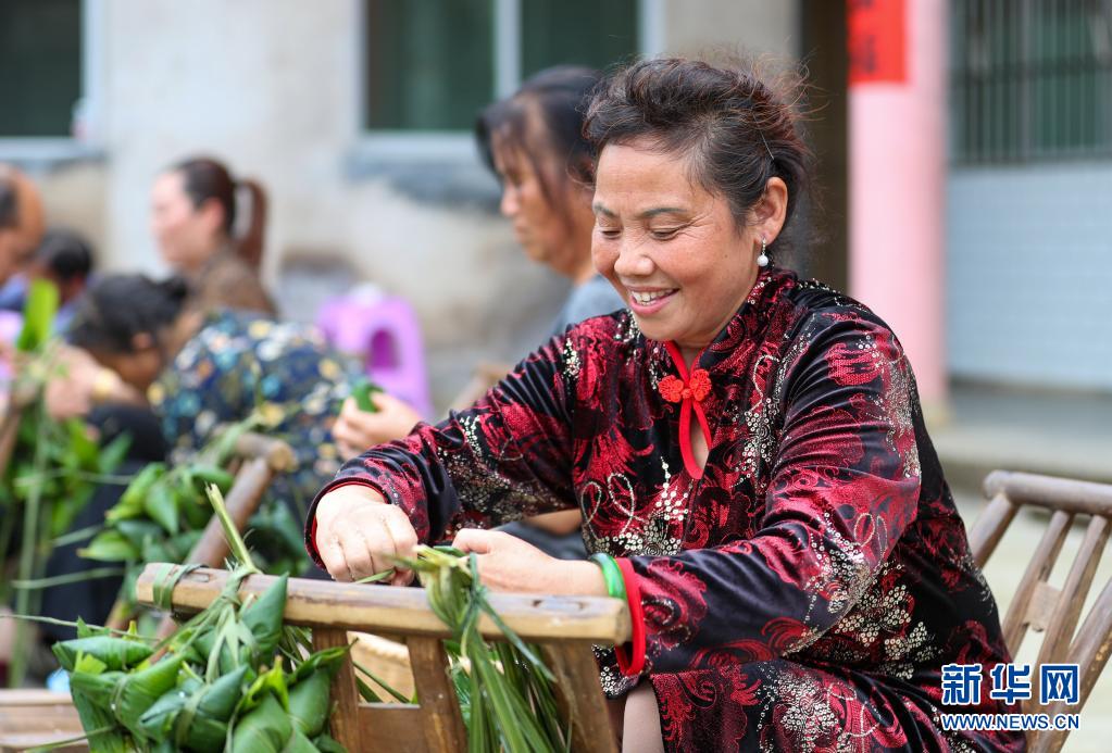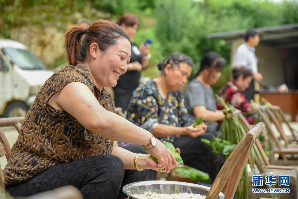 6月2日,貴州省銅仁市玉屏侗族自治縣亞魚鄉(xiāng)郭家灣村村民參加包粽子比賽。新華社發(fā)(胡攀學攝)