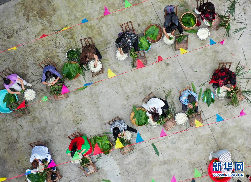 6月2日,貴州省銅仁市玉屏侗族自治縣亞魚鄉(xiāng)郭家灣村村民參加包粽子比賽(無人機照片)。新華社發(fā)(胡攀學攝)