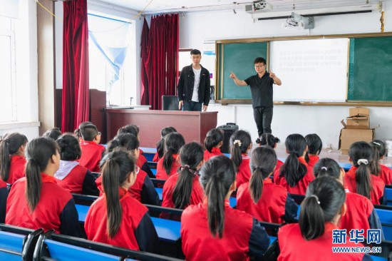 在黑龍江省安達(dá)市任民鎮(zhèn)中心小學(xué),李平(后左)和張雨在指導(dǎo)“村里的孩兒”音樂(lè)班的孩子練習(xí)合唱(5月25日攝)。新華社記者 謝劍飛 攝