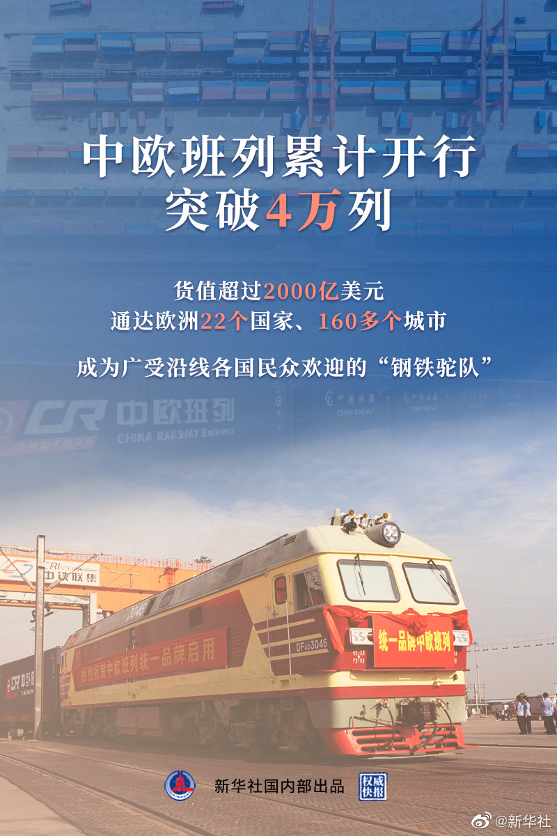 推進(jìn)“一帶一路”建設(shè)工作領(lǐng)導(dǎo)小組辦公室20日召開中歐班列統(tǒng)一品牌五周年工作座談會。截至目前,中歐班列累計(jì)開行突破4萬列,合計(jì)貨值超過2000億美元,打通了73條運(yùn)行線路,通達(dá)歐洲22個(gè)國家160多個(gè)城市。新冠肺炎疫情發(fā)生以來,中歐班列累計(jì)向歐洲發(fā)運(yùn)1199萬件防疫物資。2011年3月,首趟中歐班列從重慶發(fā)出開往德國杜伊斯堡,開啟中歐班列創(chuàng)新發(fā)展的序章。2016年6月20日,統(tǒng)一品牌中歐班列首達(dá)歐洲(波蘭)儀式在波蘭華沙舉行。(記者安蓓,海報(bào)設(shè)計(jì)楊軼群)