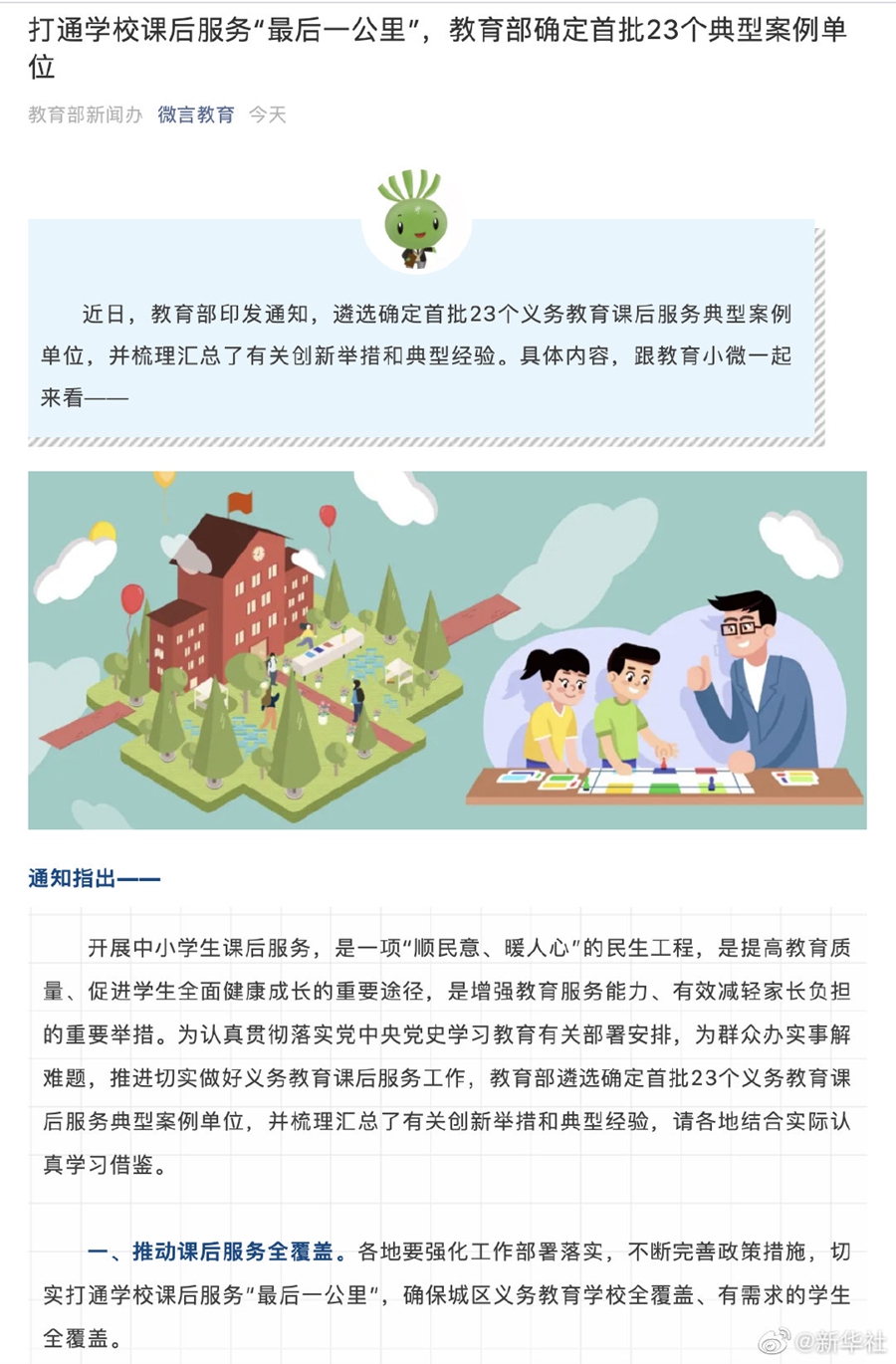 據(jù)教育部政務新媒體“微言教育”公眾號22日消息,教育部近日印發(fā)通知,為推進做好義務教育課后服務工作,遴選確定首批23個義務教育課后服務典型案例單位,并梳理匯總了有關(guān)創(chuàng)新舉措和典型經(jīng)驗,要求各地結(jié)合實際學習借鑒。通知指出,課后服務結(jié)束時間原則上不早于當?shù)仄毡榈恼O掳鄷r間后半小時;學校對有特殊需要的學生,可以提供延時托管服務,切實解決好家長接學生困難問題。學校服務性收費和代收費具體政策由各省份制訂,嚴禁以課后服務名義亂收費。 (記者余俊杰)