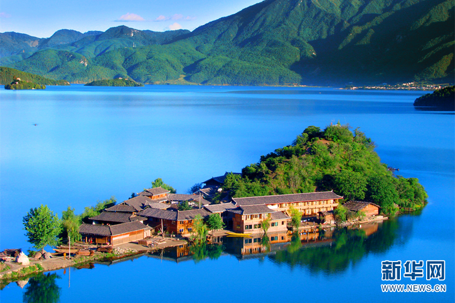 里格半島在藍(lán)天碧水的映襯下更加美麗動人。新華網(wǎng)發(fā)(麗江瀘沽湖管理局供圖)