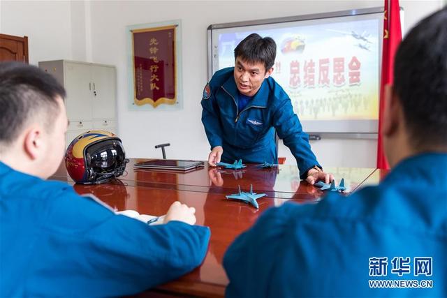 空軍航空兵某旅副參謀長姚凱(中)在大隊講評室給年輕飛行員講述對抗空戰(zhàn)比武中的經(jīng)驗教訓(xùn)(2018年9月14日攝)。新華社發(fā)(張皓陽 攝)