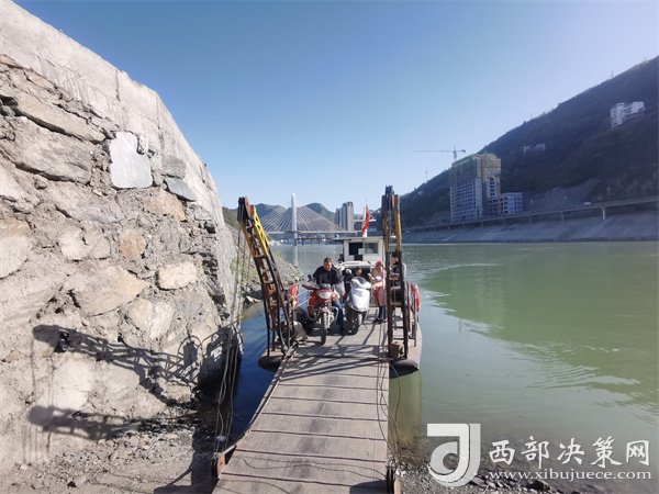 大橋通車前坐渡船過(guò)江的居民和遠(yuǎn)處的大橋