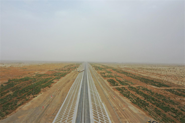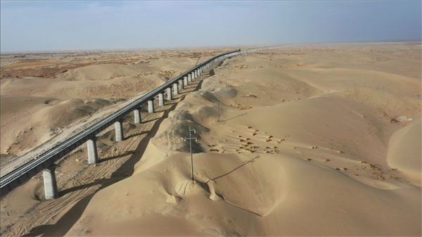 和若鐵路為國家重點鐵路建設項目,線路全長825.476公里,2018年12月開工建設,連通南疆和田地區(qū)和田市與巴音郭楞蒙古自治州若羌縣。完成鋪軌的和若鐵路與現有格庫鐵路、喀和鐵路、南疆鐵路連通,環(huán)繞塔克拉瑪干沙漠一周,構成世界首條環(huán)沙漠鐵路線。
