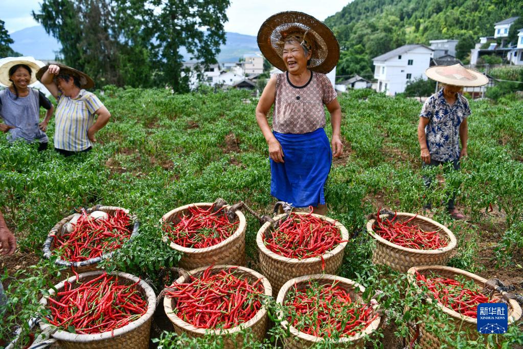 村民在貴陽(yáng)農(nóng)投集團(tuán)奇申蔬菜基地采收牛角椒(7月29日攝)。新華社記者 陶亮 攝