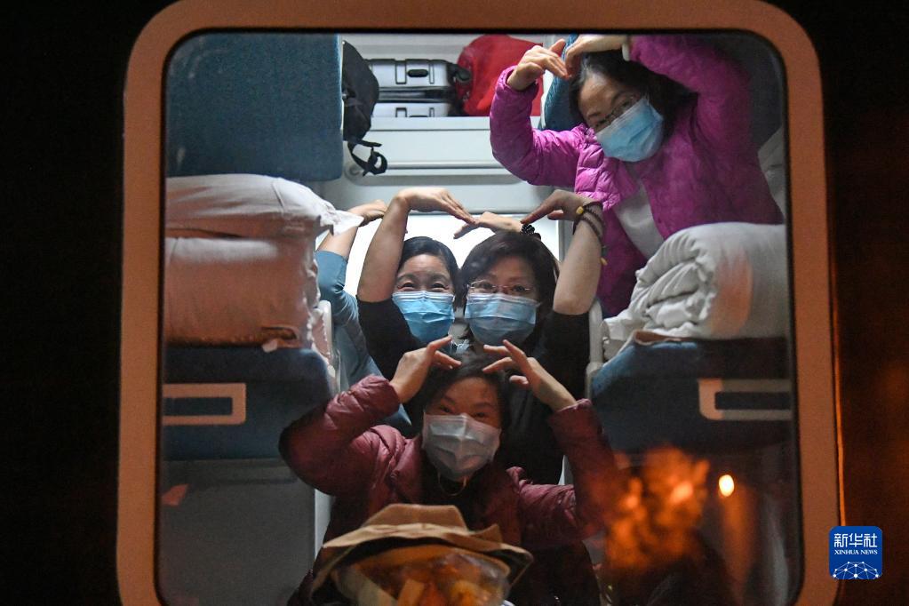 10月29日,滯留游客離開額濟納旗時,在列車車廂里擺出一個個“愛心”。新華社發(fā)(王磊 攝)