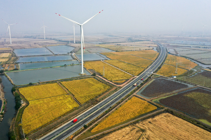 圖為11月3日拍攝的江蘇省揚州市寶應(yīng)縣魯垛鎮(zhèn)5.28萬千伏安風(fēng)力發(fā)電項目(無人機(jī)照片)。新華社記者 李博 攝