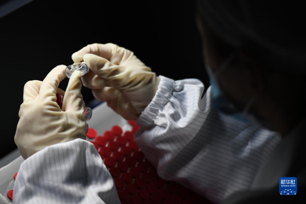 在安徽智飛龍科馬生物制藥有限公司新冠疫苗生產(chǎn)線上,工作人員對(duì)疫苗進(jìn)行人工檢測(cè)(5月25日攝)。新華社記者 張端 攝