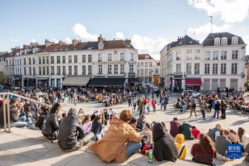 人們在法國里爾市中心休閑(2021年5月19日攝)。新華社發(fā)(塞巴斯蒂安·庫爾吉攝)