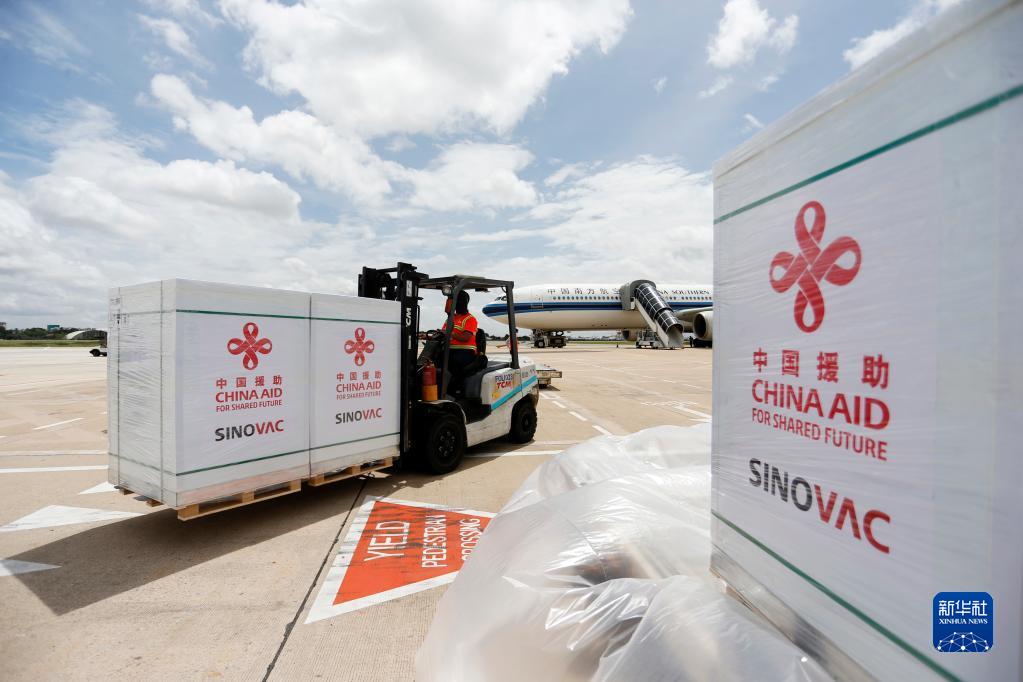 工作人員在柬埔寨金邊國際機(jī)場運(yùn)輸中國政府援助柬埔寨的科興新冠疫苗(2021年10月14日攝)。新華社發(fā)(批隆攝)