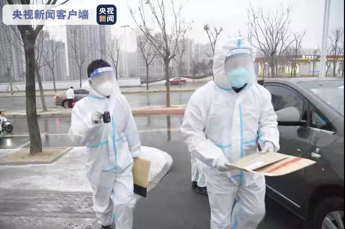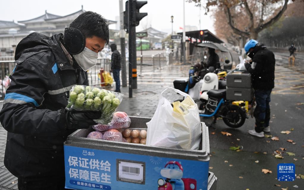 12月25日,外賣人員張欣(左一)在西安市小寨東路一封控小區(qū)配送蔬菜。這幾天,他的業(yè)務量是平時的兩倍。新華社記者 陶明 攝