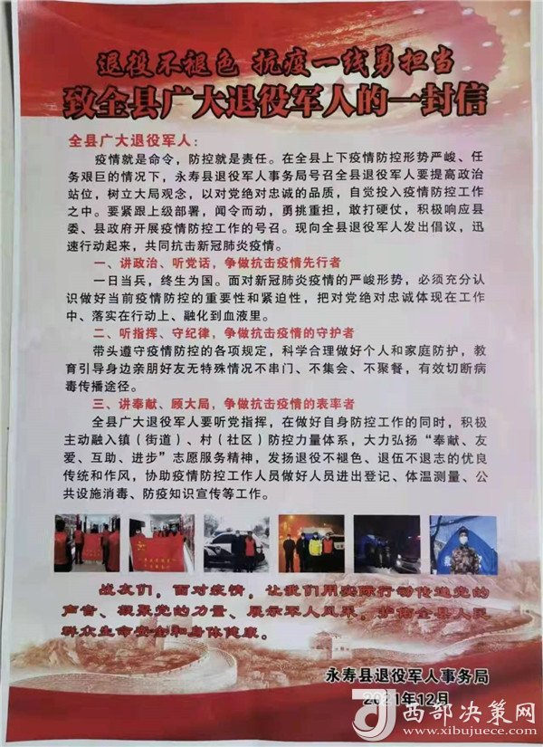 西部決策網(wǎng)訊(王江) “我志愿加入永壽縣退役軍人志愿者服務(wù)隊(duì),不記報(bào)酬,不論生死,聽從黨和政府安排,絕不退后!退役不褪色、退伍不落伍、轉(zhuǎn)業(yè)不轉(zhuǎn)志”,退役軍人依然是人民的子弟兵,心中時(shí)刻裝著祖國和人民,在新型肺炎疫情來襲之際,退役軍人紛紛請戰(zhàn)。