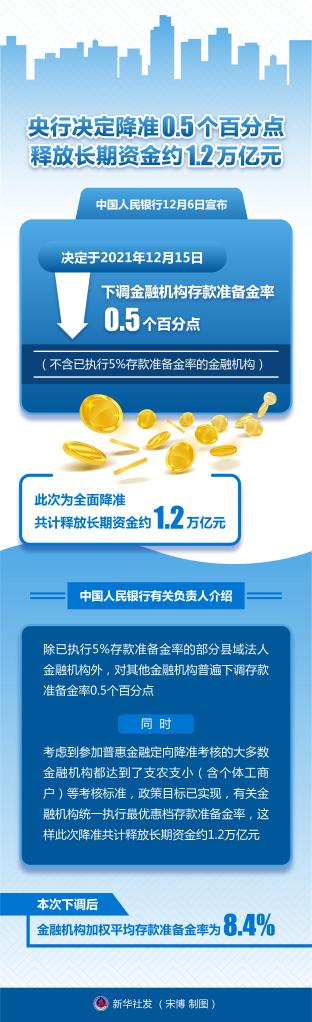 中國人民銀行12月6日宣布,決定于2021年12月15日下調(diào)金融機(jī)構(gòu)存款準(zhǔn)備金率0.5個百分點(diǎn)(不含已執(zhí)行5%存款準(zhǔn)備金率的金融機(jī)構(gòu))。此次為全面降準(zhǔn),共計(jì)釋放長期資金約1.2萬億元。新華社發(fā) 宋博 制圖