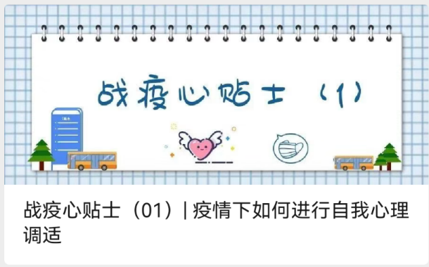 疫情防控期間,考慮到學(xué)生學(xué)習(xí)生活場所受限,學(xué)生情緒容易受到環(huán)境影響。心理健康教育中心通過新媒體開展“戰(zhàn)疫心貼士”、心語FM專欄,每天為該校學(xué)生推送疫情心理調(diào)節(jié)小妙招及各類心理援助資源。相繼發(fā)布的15篇推文有效地幫助學(xué)生們掌握了有關(guān)疫情的心理健康知識(shí),學(xué)會(huì)了自我健心減壓,引導(dǎo)他們理性對待疫情,不恐慌、不信謠、不傳謠,保持良好心理狀態(tài)。