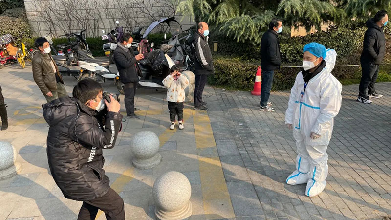 2022年1月4日,人民日?qǐng)?bào)社記者原韜雄(左一)在新冠確診病例收治點(diǎn)西安市胸科醫(yī)院采訪。