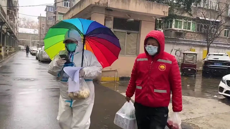 2021年12月25日,西安日?qǐng)?bào)社記者李東峰(右)在采訪之余,為西安市蓮湖區(qū)勞動(dòng)一坊社區(qū)居家隔離戶送菜。