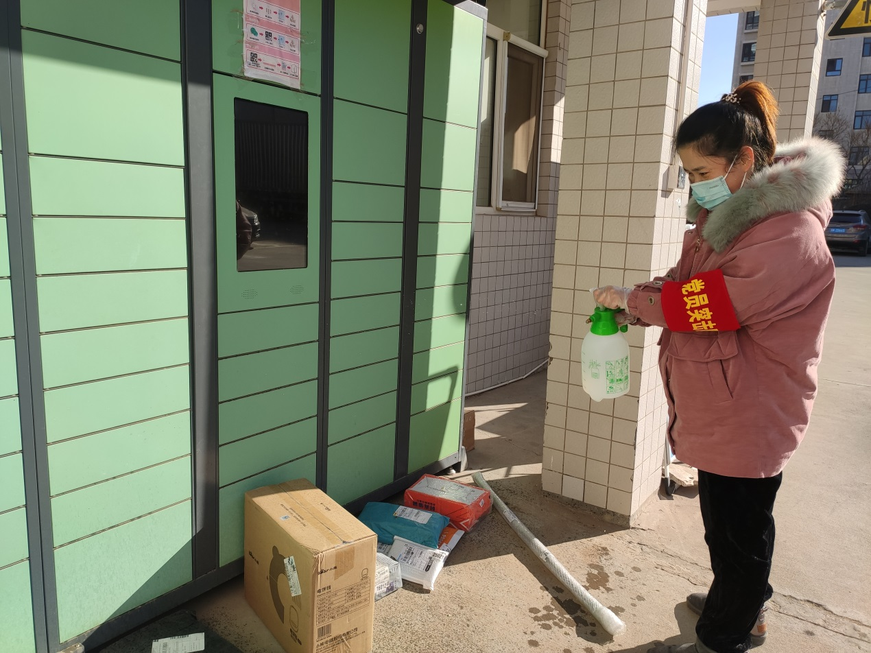 黨員突擊隊(duì)隊(duì)員索媛在值守小區(qū)對(duì)快遞進(jìn)行消毒