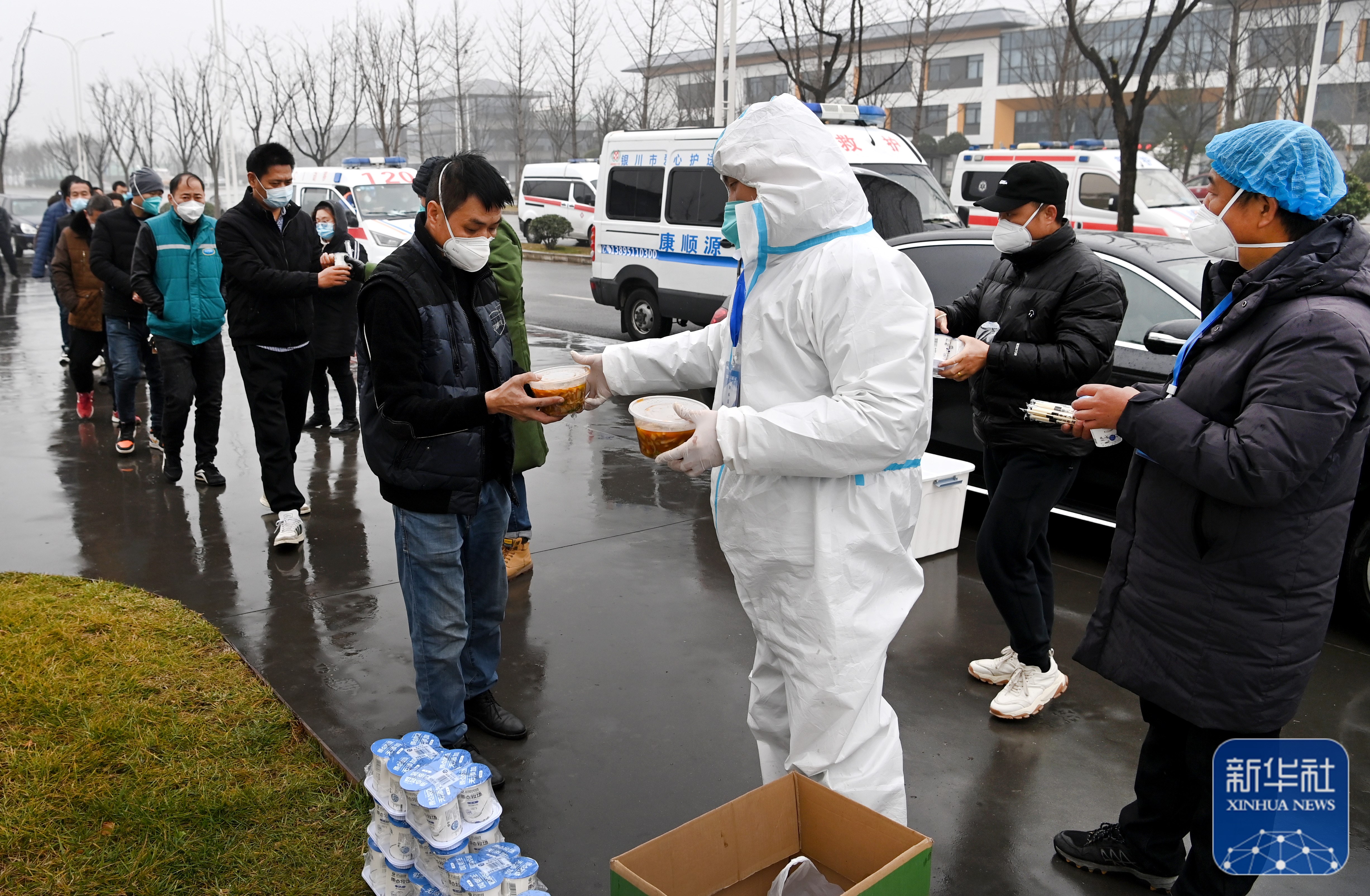 1月8日,志愿者(右三)在為防疫一線人員發(fā)放“愛(ài)心餐”。