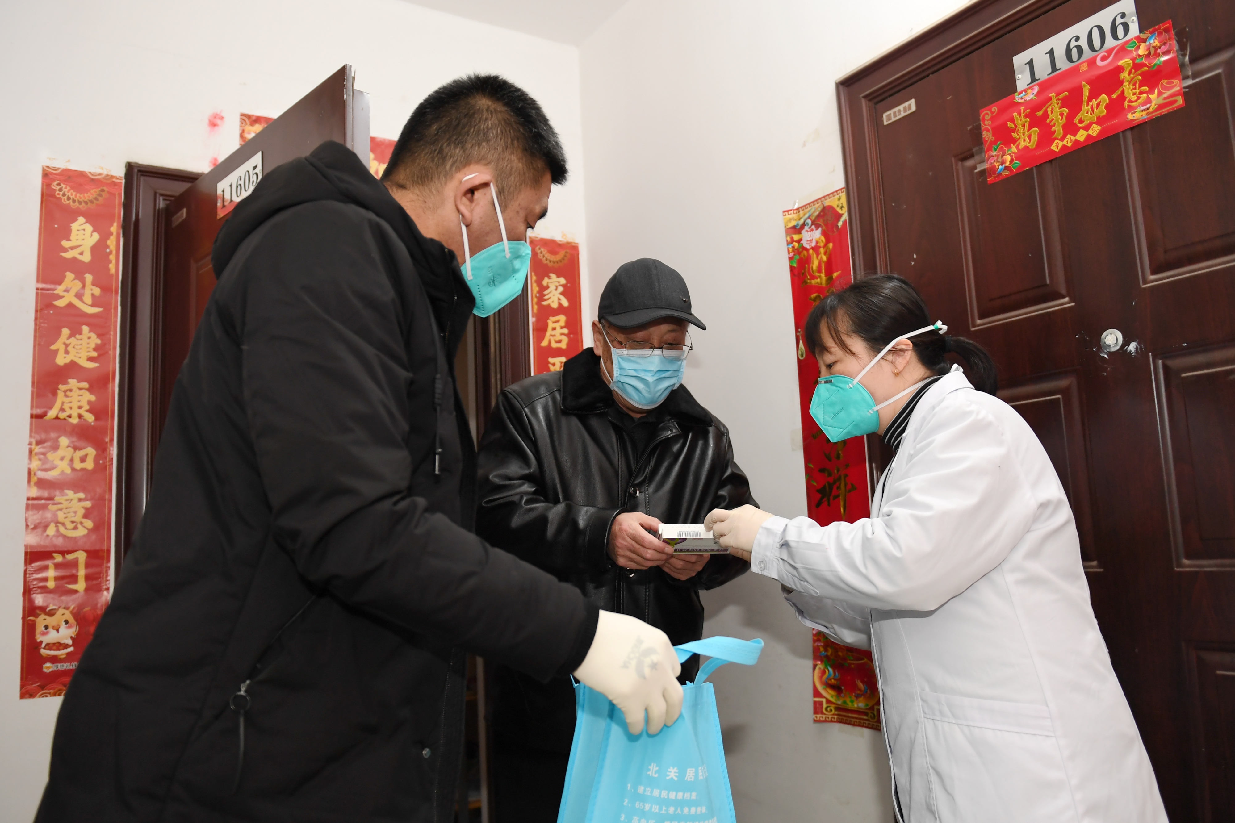 1月8日,在西安秦地雅仕小區(qū),蓮湖區(qū)北關(guān)社區(qū)衛(wèi)生服務中心檢驗師韓涼(右)為電話就醫(yī)的患者送藥上門。新華社記者 李一博 攝