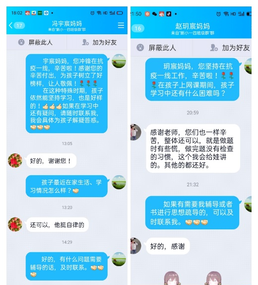 面對家長在抗“疫”一線經(jīng)受的各種考驗,孩子們時刻惦記,情緒起伏較大。班主任和任課老師密切溝通,溫暖陪伴,守護抗“疫”一線工作人員子女的心理健康。通過微信視頻連線、電話等方式與孩子們密切溝通,用質(zhì)樸的話語與孩子們談心,帶去學校的關心和溫暖,緩解他們不安的情緒。
