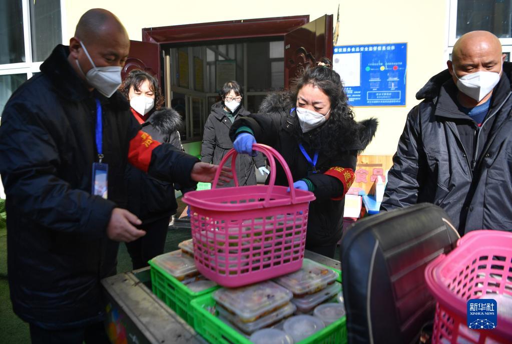 1月12日,三家村工作人員將打包好的午餐裝車準(zhǔn)備派送。新華社記者 張博文 攝