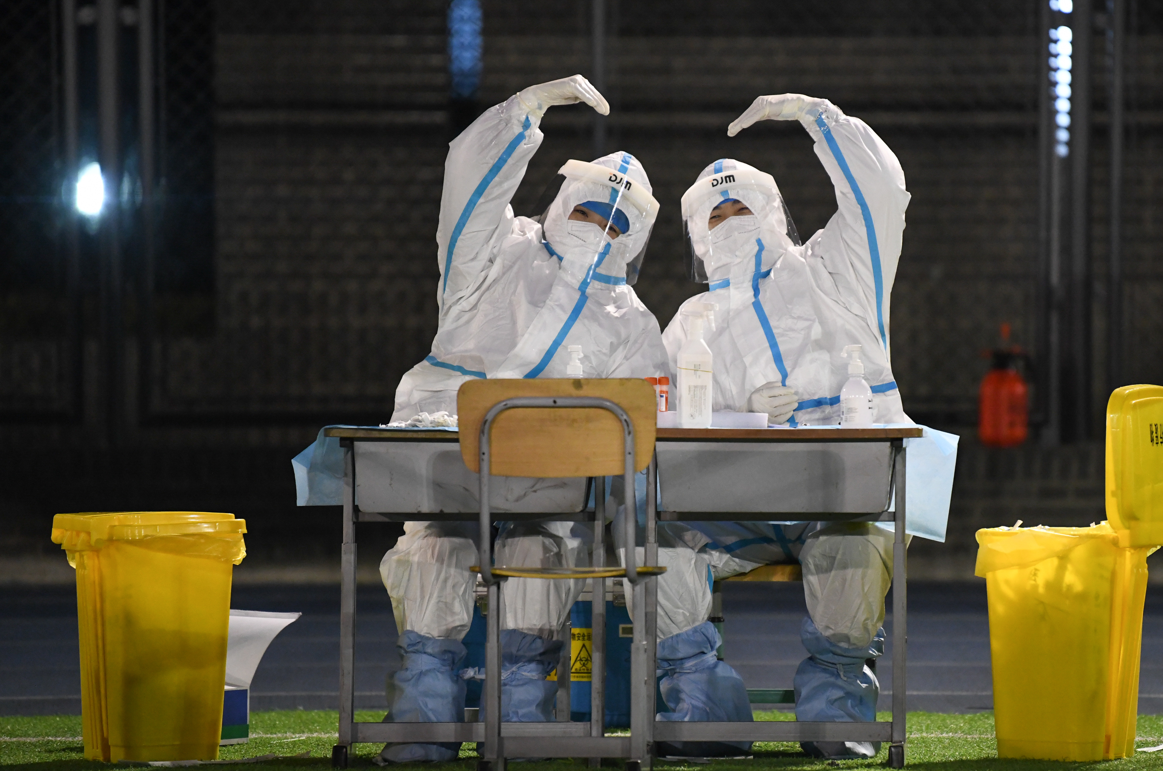 2022年1月10日凌晨,在天津市南開區(qū)鼓樓街道中營小學核酸檢測點,兩名醫(yī)務人員做出“比心”手勢。新華社記者 孫凡越 攝