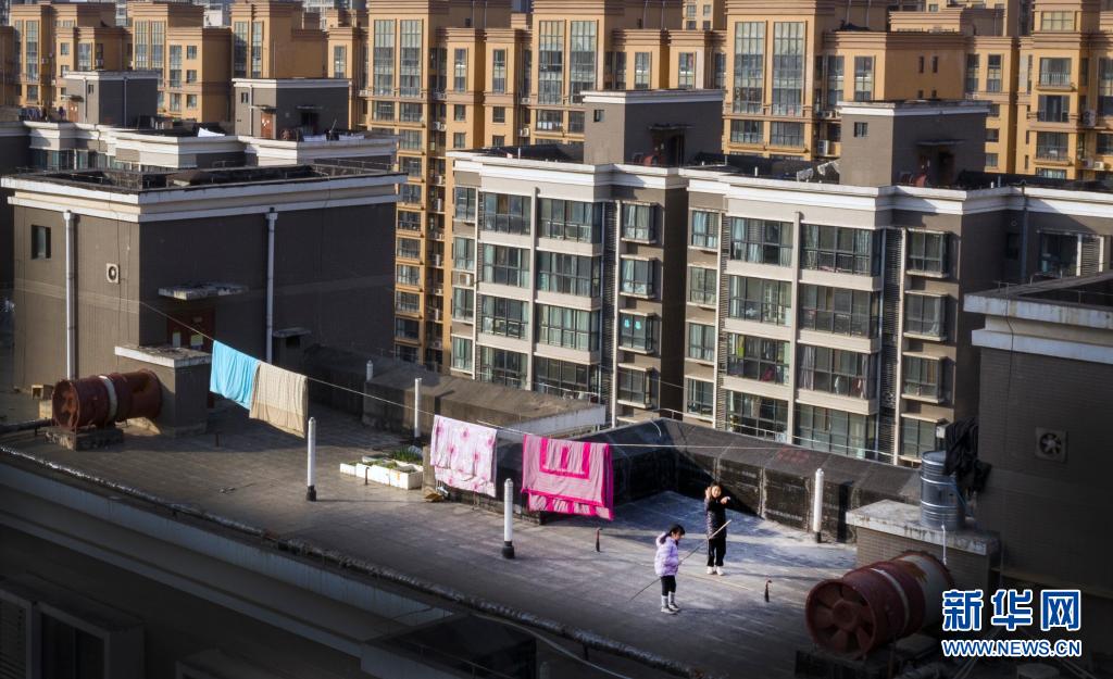 1月13日,西安市一小區(qū)居民在樓頂上休閑鍛煉(無人機(jī)照片)。新華社記者 陶明 攝
