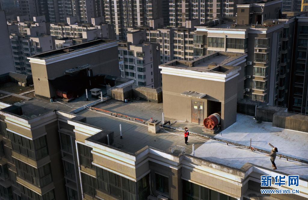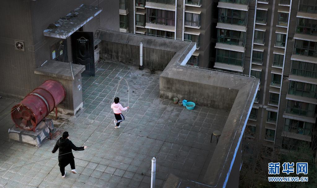 1月14日,西安市一小區(qū)居民在樓頂上跳繩鍛煉(無人機(jī)照片)。新華社記者 陶明 攝