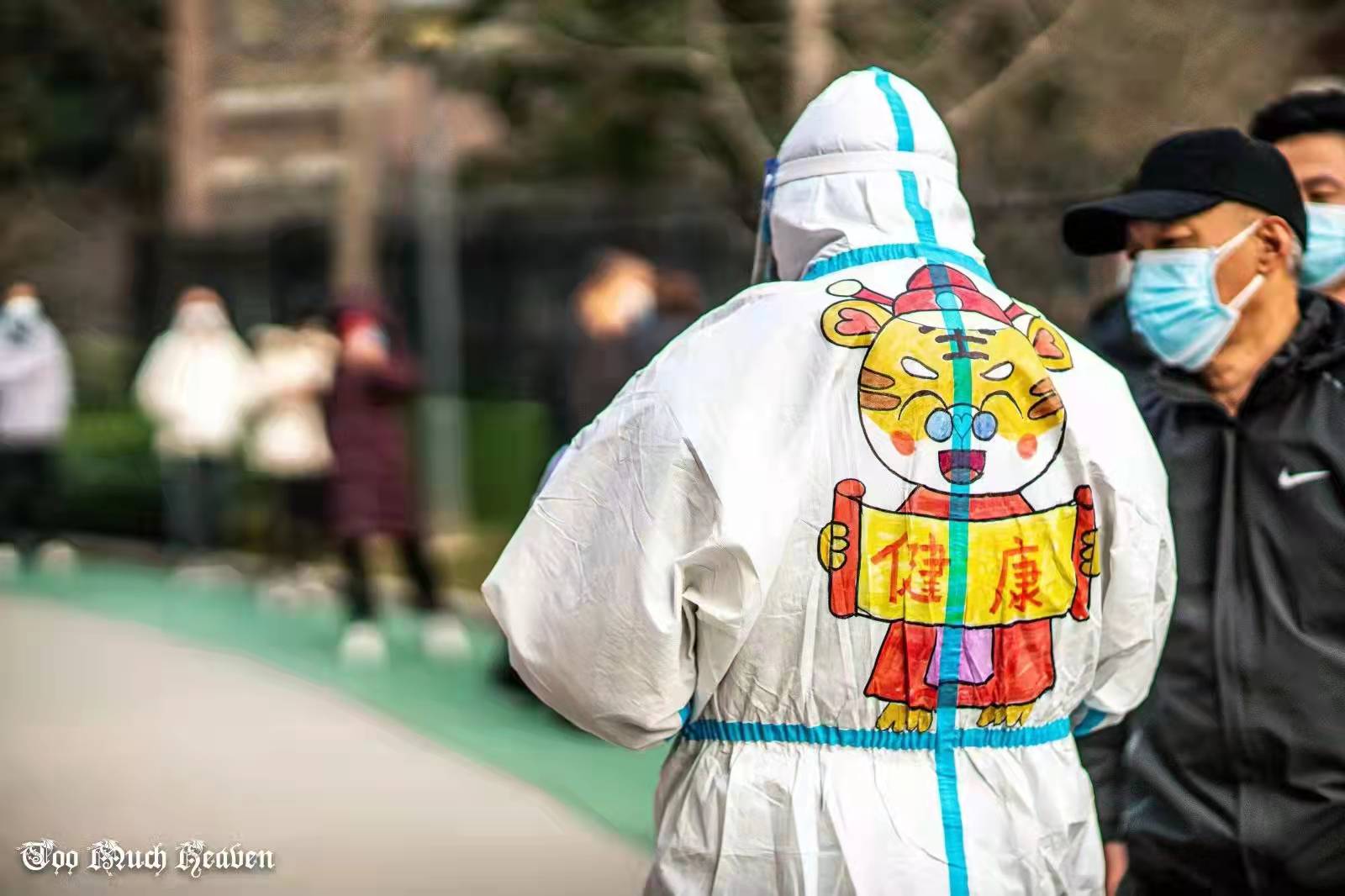 這個小區(qū)有13位志愿者組成了“抗疫志愿者先鋒隊”,全程協(xié)助醫(yī)護人員做好核酸篩查工作。隊長黨王杰每天要在防護服上為大家編號、寫名字,以示區(qū)分。有一天,他寫著寫著突然來了主意,“在防護服上畫點不一樣的圖案行不行?疫情向好,新春臨近,來個虎年主題?”