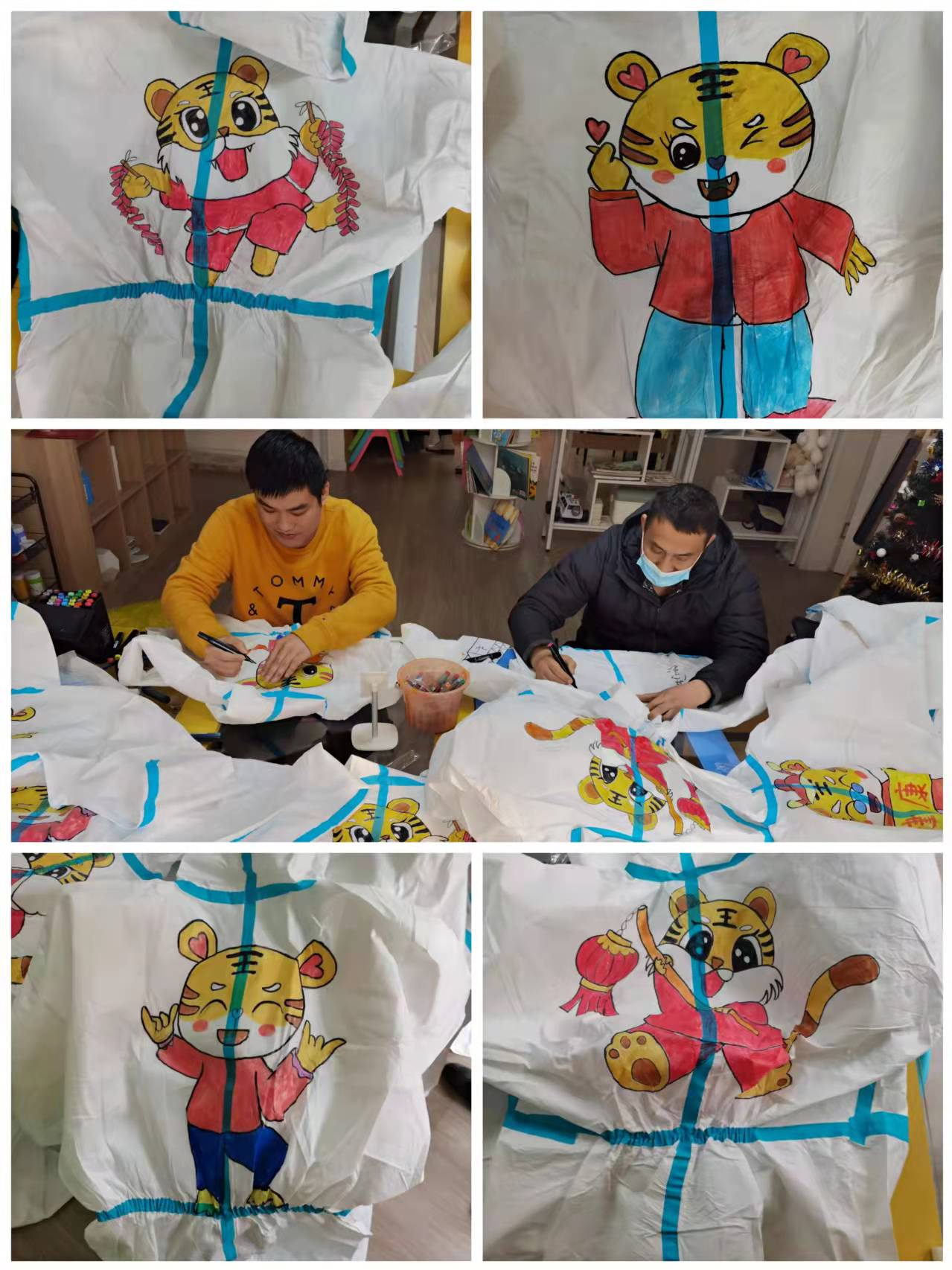 年輕人坐在一起“頭腦風暴”,說干就干,思考、設計出了虎年主題的防護服系列圖案。吳捷說:“這一系列作品,就是希望大家虎虎生威,遠離病毒!”